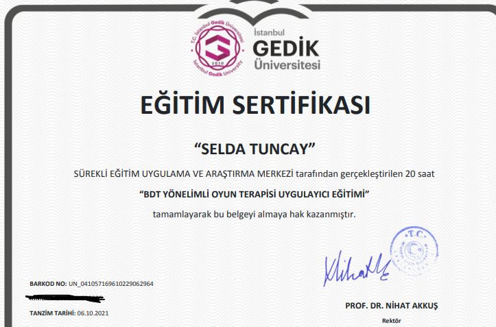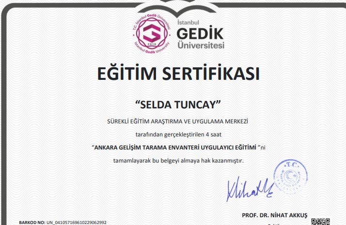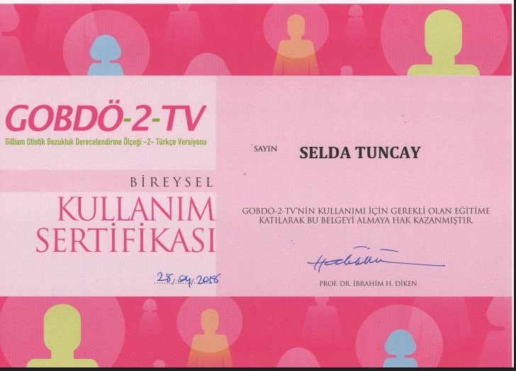 • “GOBDÖ-2-TV (Gilliam Otistik Bozukluk Derecelendirme Ölçeği-2- Türkçe Versiyonu) Bireysel Kullanım Sertifikası” The Merlot Hotel, Eskişehir, 28 Nisan 2018