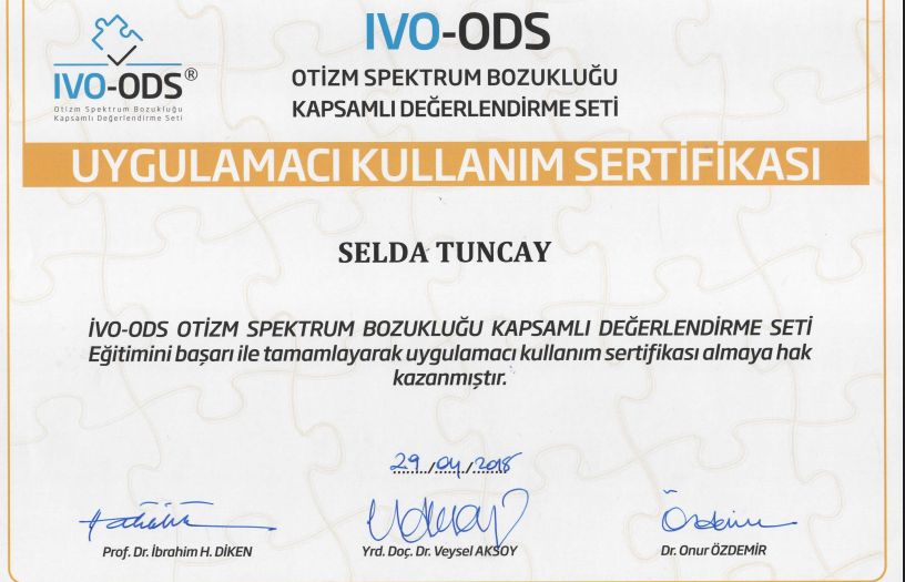 • IVO-ODS (Otizm Spektrum Bozukluğu Kapsamlı Değerlendirme Seti) Uygulamacı Kullanım Sertifikası” The Merlot Hotel, Eskişehir, 28 Nisan 2018