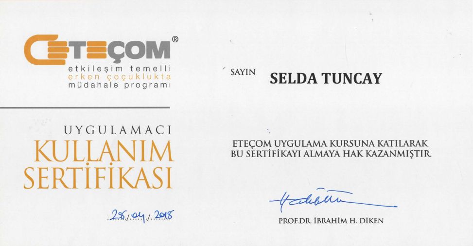 • “ETEÇOM (Etkileşim Temelli Erken Çocuklukta Müdahale Programı) Uygulamacı Kullanım Sertifikası” The Merlot Hotel, Eskişehir, 28 Nisan 2018