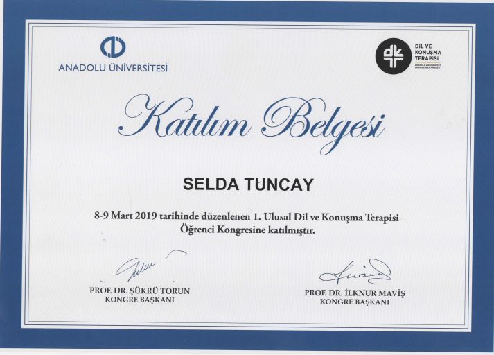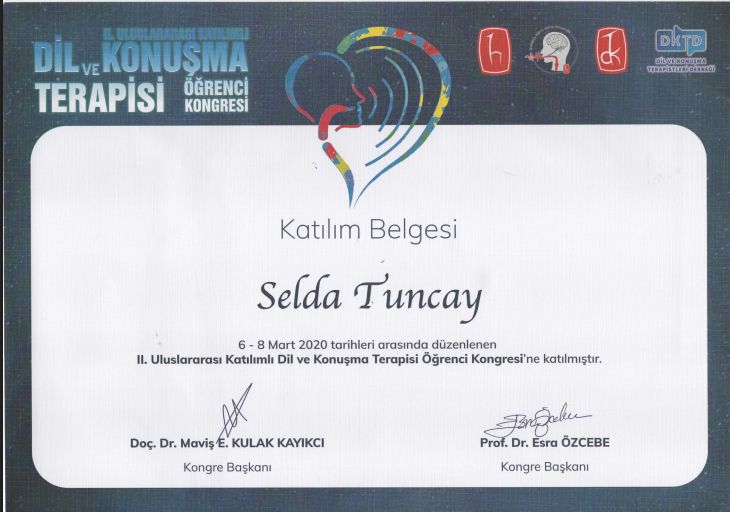 • “II. Uluslararası Katılımlı Dil ve Konuşma Terapisi Öğrenci Kongresi” Hacettepe Üniversitesi, Ankara, 6-8 Mart 2020