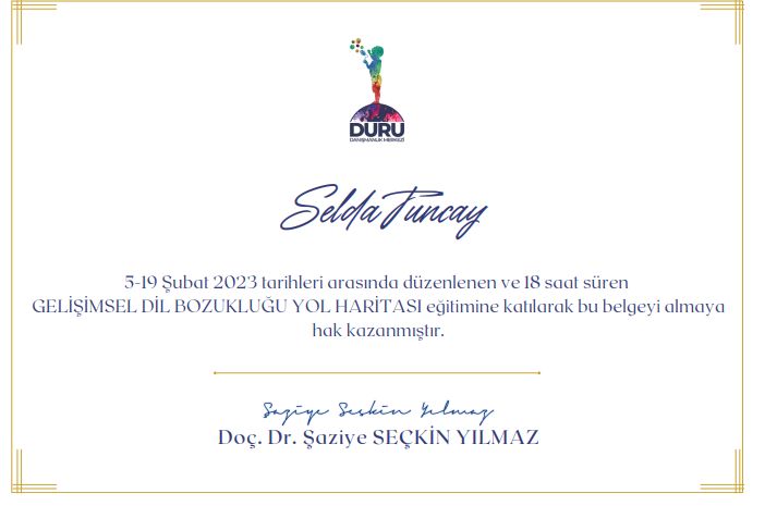 • Gelişimsel Dil Bozukluğu Yol Haritası, Duru Danışmanlık Merkezi, (Şaziye SEÇKİN YILMAZ), 5-19 Şubat 2023