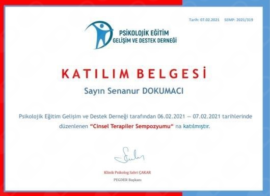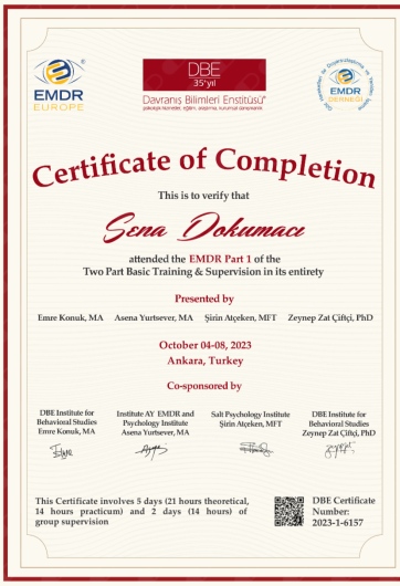 Ayrıca, Avrupa akrediteli EMDR 1. Düzey eğitimini tamamlamış olup, Varoluşçu Akademi tarafından verilen Temel Varoluşçu Psikoterapi Eğitimine devam etmektedir.