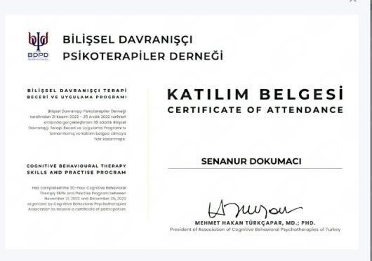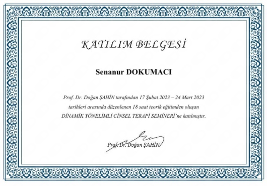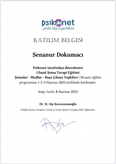 Psikiyatrist Dr. Alp Karaosmanoğlu'ndan Şema Terapi eğitimini tamamlamıştır.
