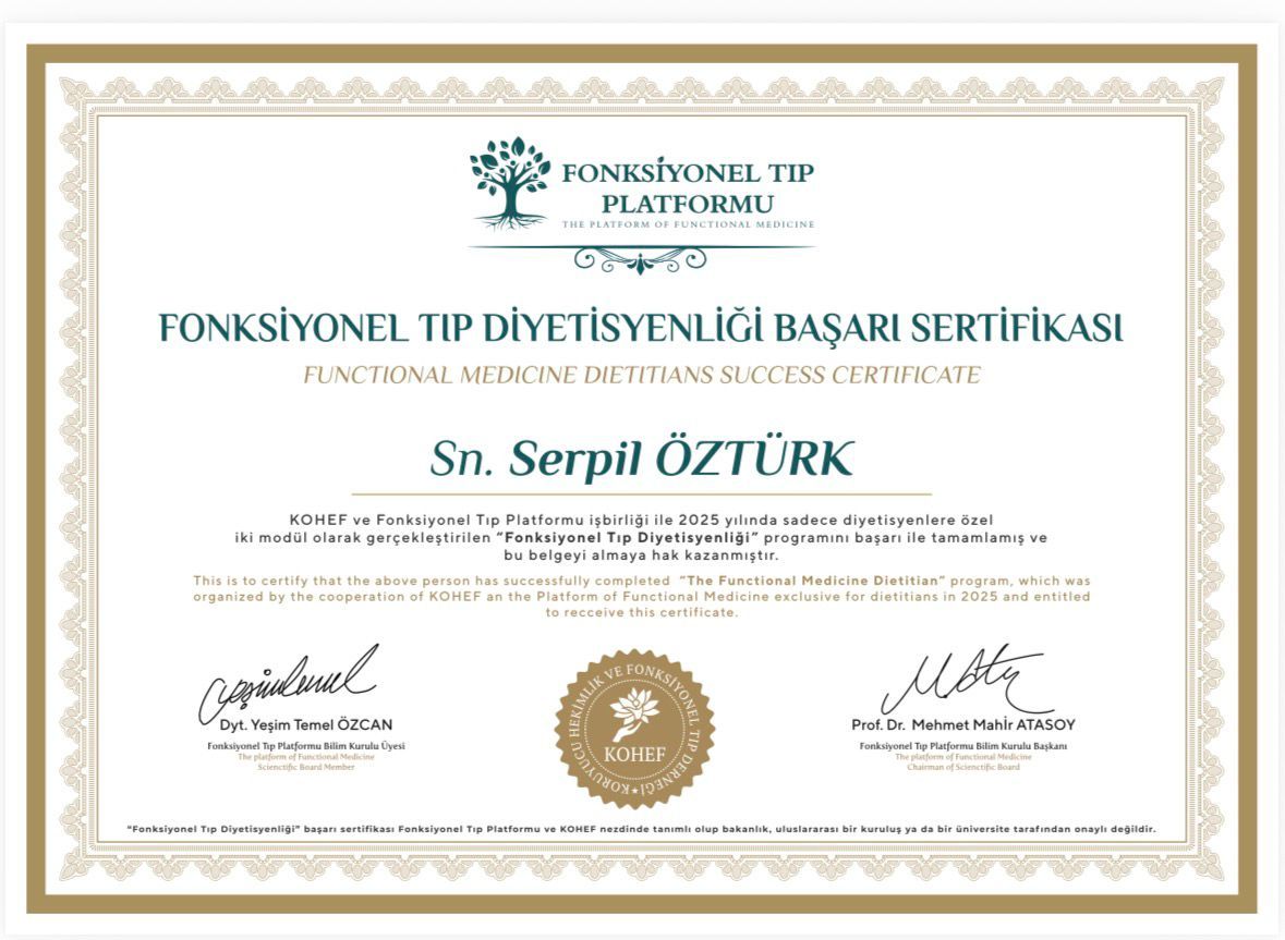 Bilimsel gelişmeleri yakından takip ederek Fonksiyonel Tıp alanında eğitimler aldım; Fonksiyonel Tıp ve İleri Seviye Fonksiyonel Tıp eğitimlerini tamamlayarak Fonksiyonel Tıp Diyetisyeni olarak çalışmalarımı sürdürmekteyim. Çalışmalarımı iki temel yaklaşım üzerine inşa ediyorum: