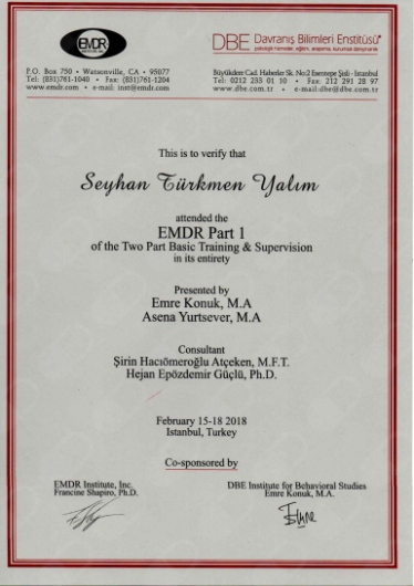 * Dikkat eksikliği olan, öfkeli, zor çocuklarla ve travma geçirmiş çocuklarla terapötik çalışma ( Working With ADHD, Angry& traumatized Children) yöntemlerinin uygulama eğitimlerini Klinik Psikolog Reyhana Seedat önderliğinde tamamladım.. Süpervizyon çalışmalarına halen devam etmekteyim.