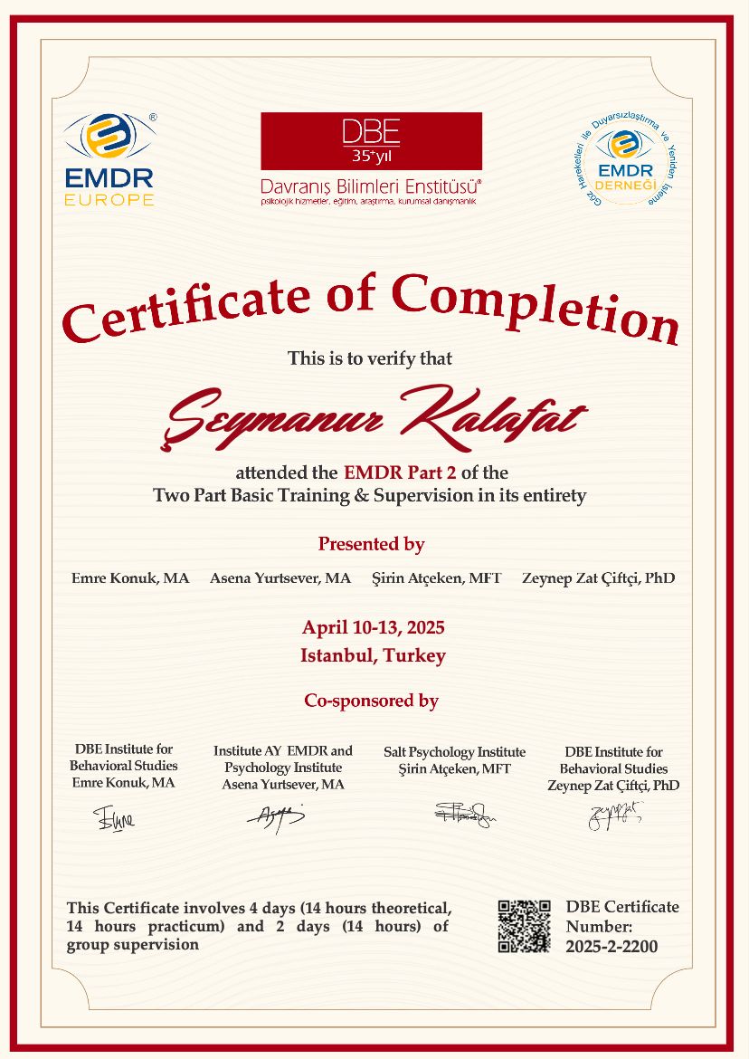 Uzman Klinik Psikolog Şeymanur Kalafat’ın almış olduğu eğitimler aşağıdaki gibidir: