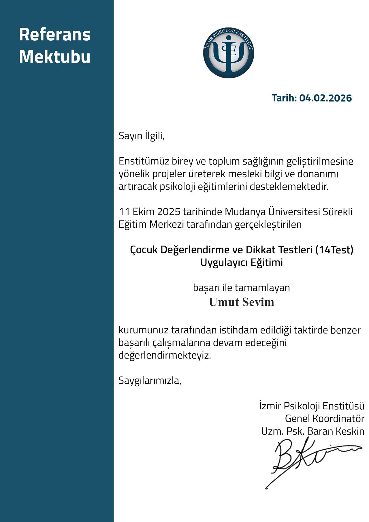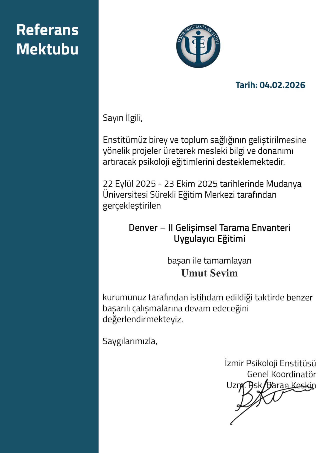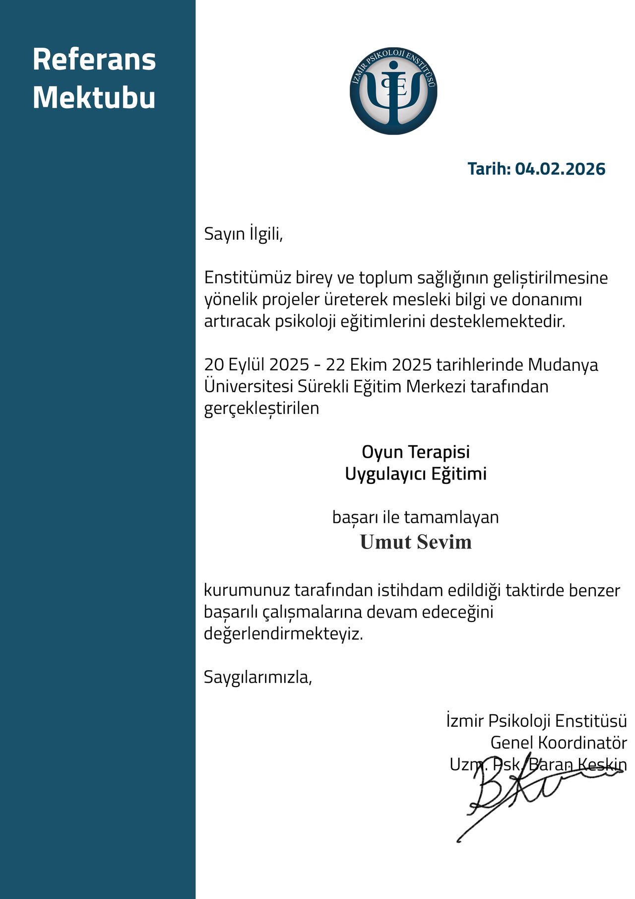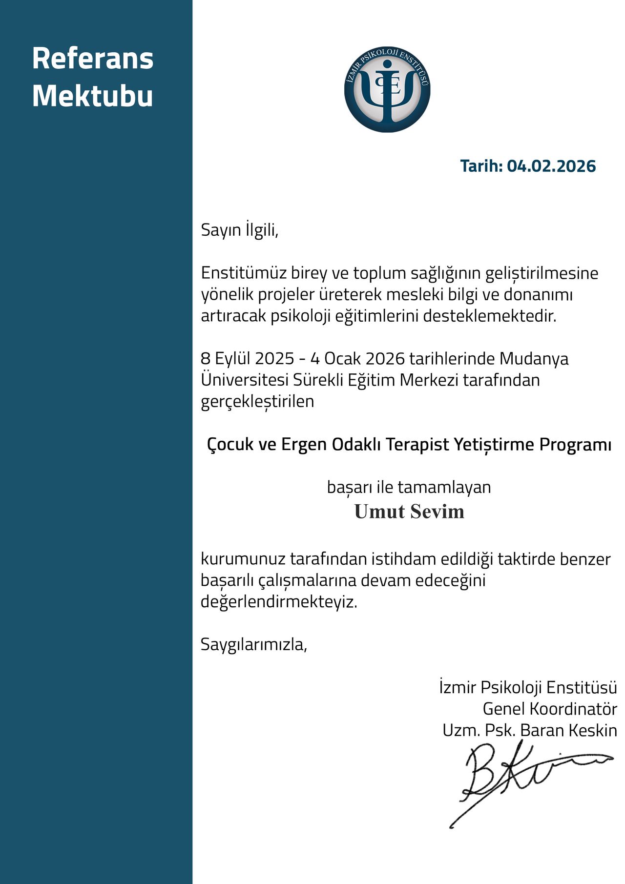 Mesleki yetkinliğimi korumak ve geliştirmek adına, alanın önde gelen uzmanlarından Prof. Dr. Hakan Türkçapar (BDT), Dr. Alp Karaosmanoğlu (Şema Terapi) ve Prof. Dr. Doğan Şahin (Psikodinamik Psikoterapi) gibi isimlerden eğitimler aldım. Şu anda aktif olarak İzmir Psikoloji Enstitüsü Çocuk ve Ergen Terapist Yetiştirme Programı'na devam etmekte ve düzenli süpervizyon eşliğinde danışan görmekteyim.