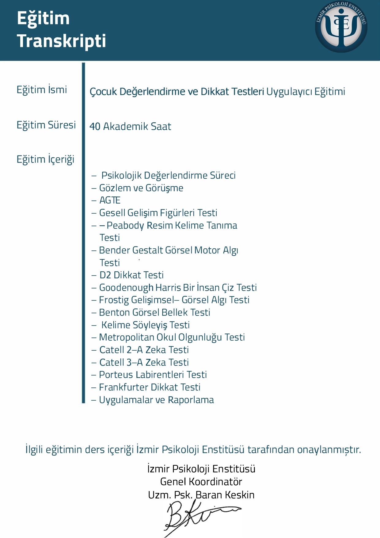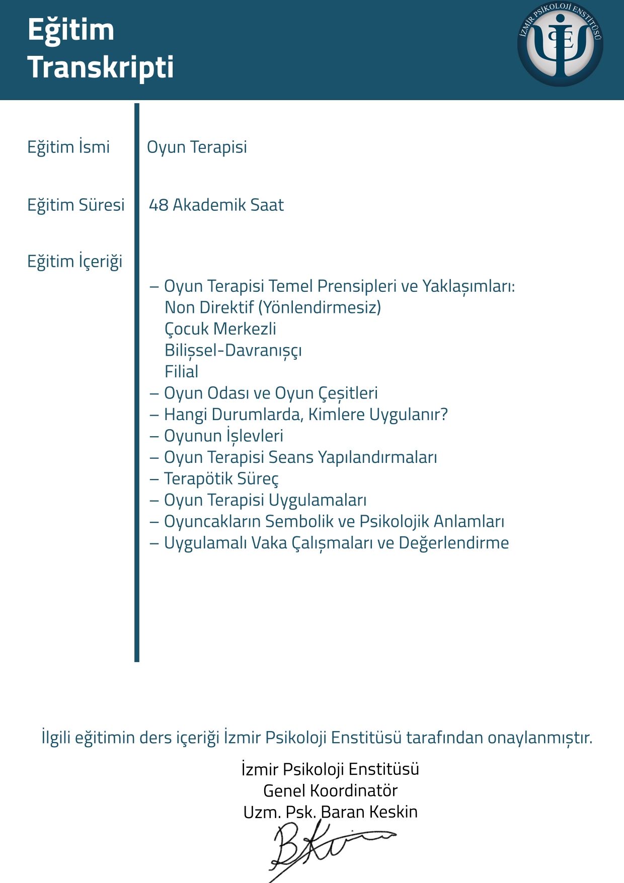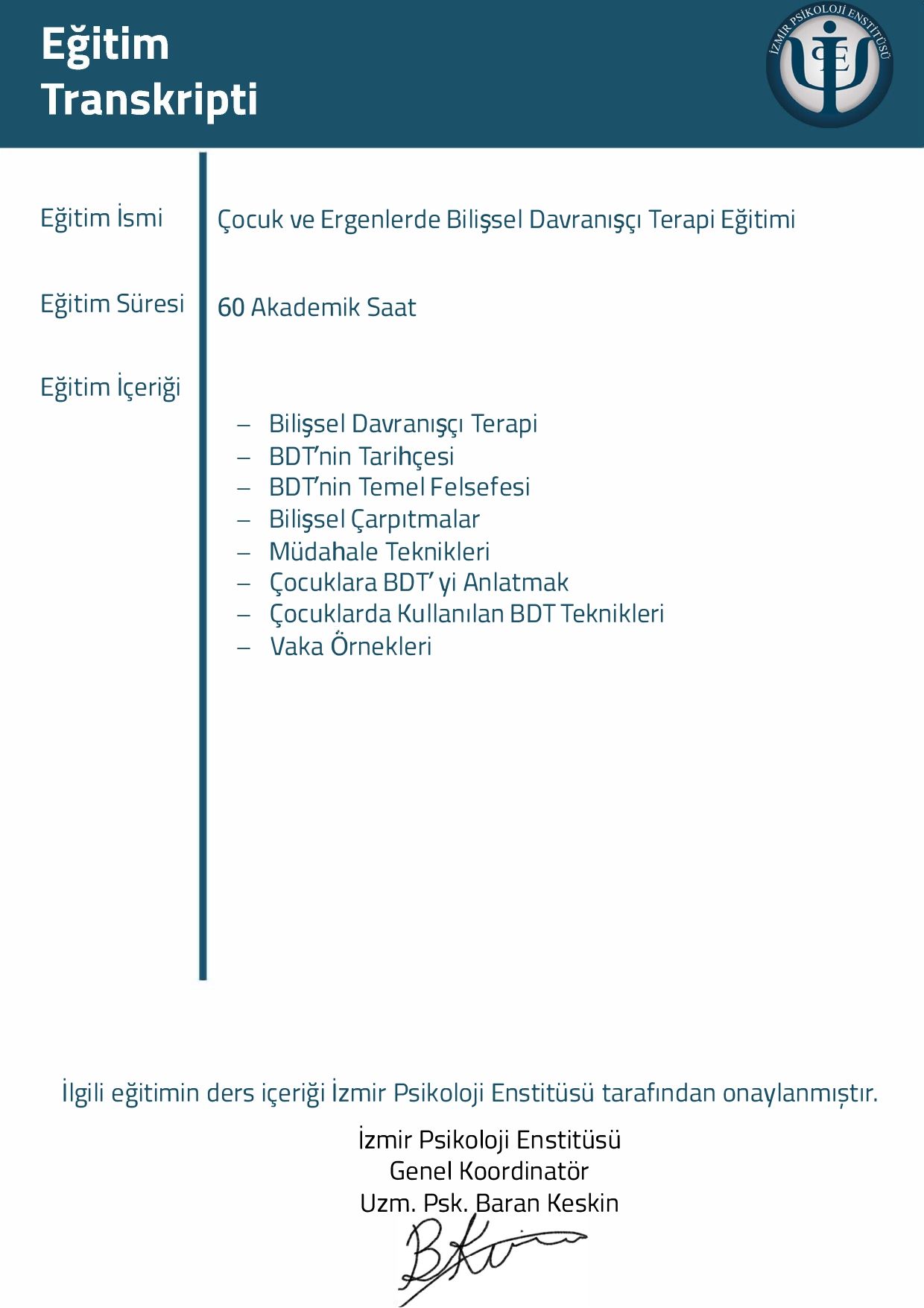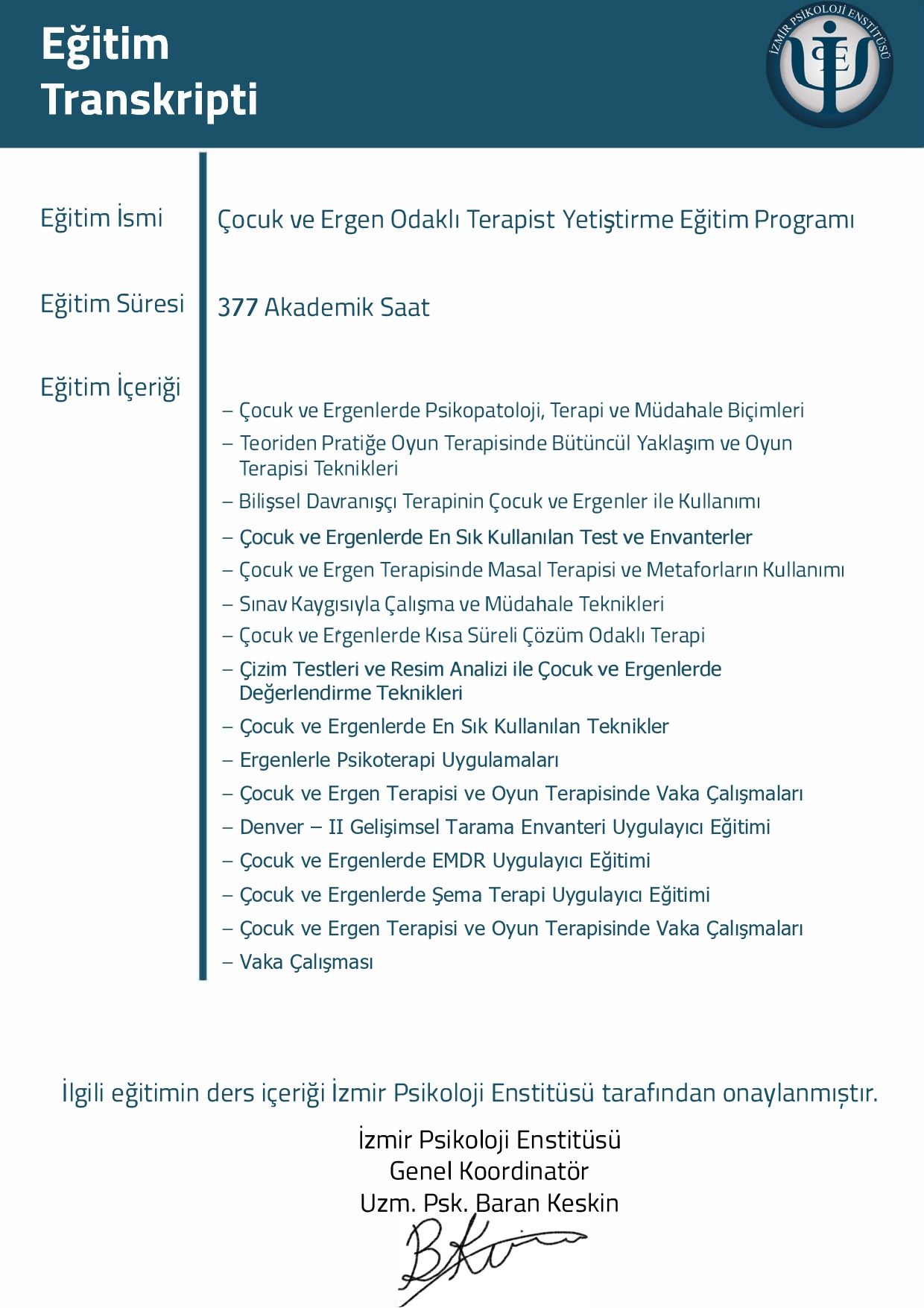 Mesleki yetkinliğimi korumak ve geliştirmek adına, alanın önde gelen uzmanlarından Prof. Dr. Hakan Türkçapar (BDT), Dr. Alp Karaosmanoğlu (Şema Terapi) ve Prof. Dr. Doğan Şahin (Psikodinamik Psikoterapi) gibi isimlerden eğitimler aldım. Şu anda aktif olarak İzmir Psikoloji Enstitüsü Çocuk ve Ergen Terapist Yetiştirme Programı'na devam etmekte ve düzenli süpervizyon eşliğinde danışan görmekteyim.