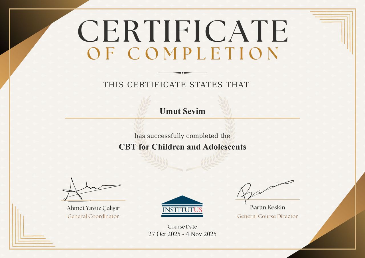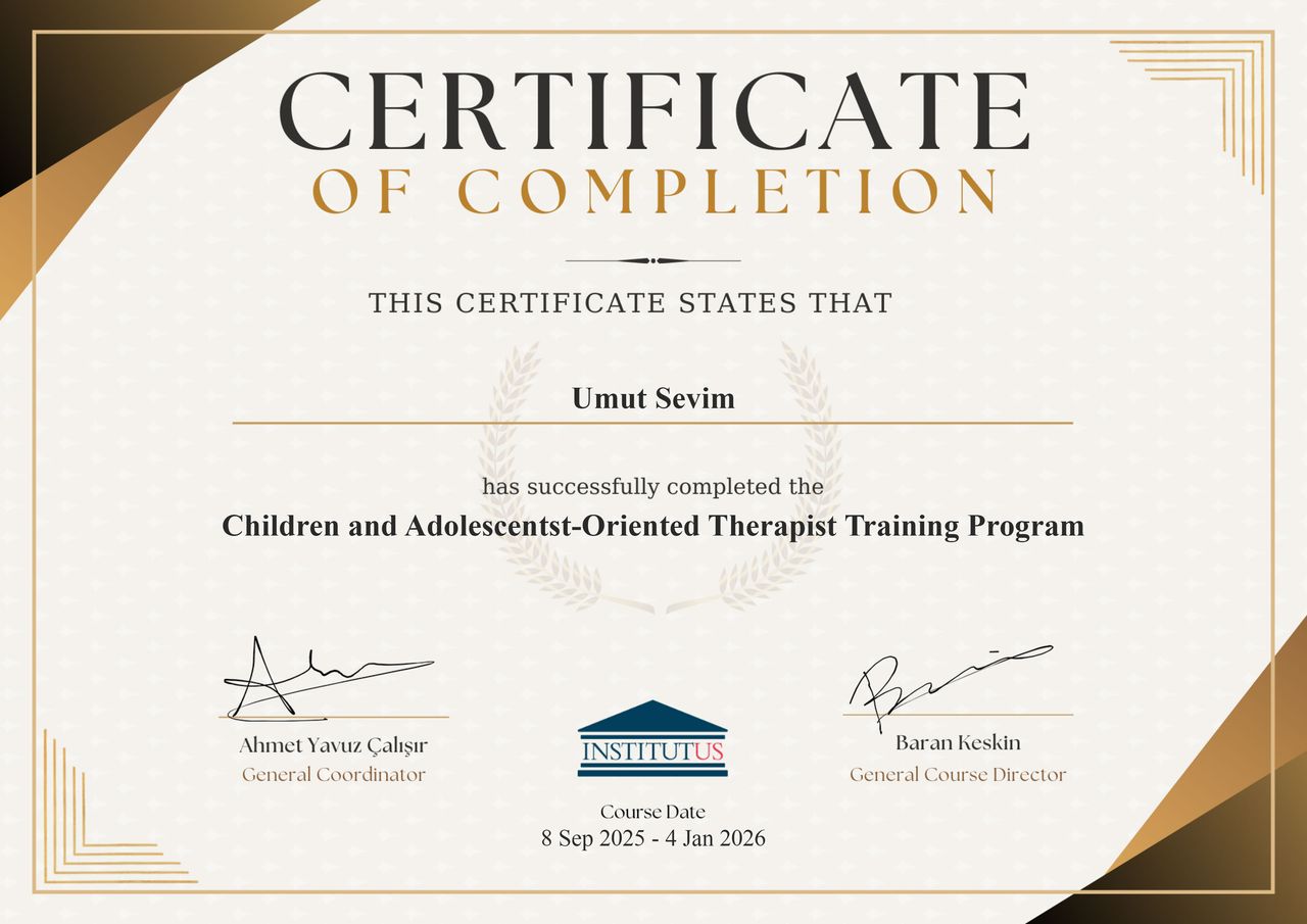 Merhaba, ben Psikolog Umut Sevim. Orta Doğu Teknik Üniversitesi (ODTÜ) Psikoloji bölümünden onur derecesiyle mezun oldum. Mesleki pratiğimde çocuk, ergen ve genç yetişkinlerin yaşadığı duygusal ve davranışsal zorluklara odaklanmaktayım.