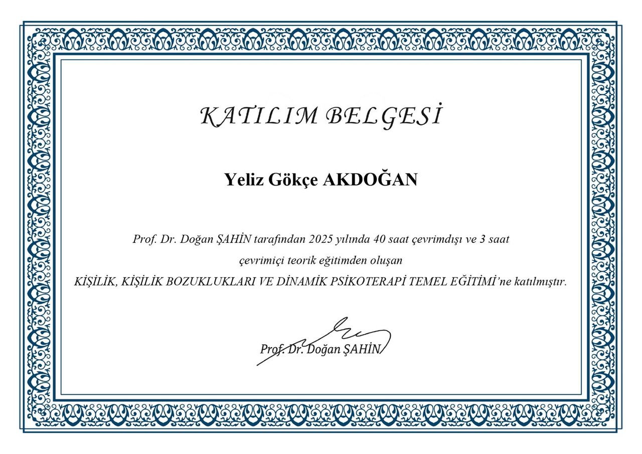 Merhaba, ben Yeliz Gökçe Akdoğan. TED Üniversitesi Psikoloji bölümünden onur öğrencisi olarak mezun oldum. Lisans hayatım boyunca psikodinamik ekol üzerine seçmeli dersler aldım ve dinamik ekolde çalışan çeşitli klinik psikologların yanında stajyer olarak çalıştım. Lisans eğitimimi tamamladıktan sonra Okan Üniversitesi Klinik Psikoloji yüksek lisansına başladım, şu an ise tez dönemindeyim.