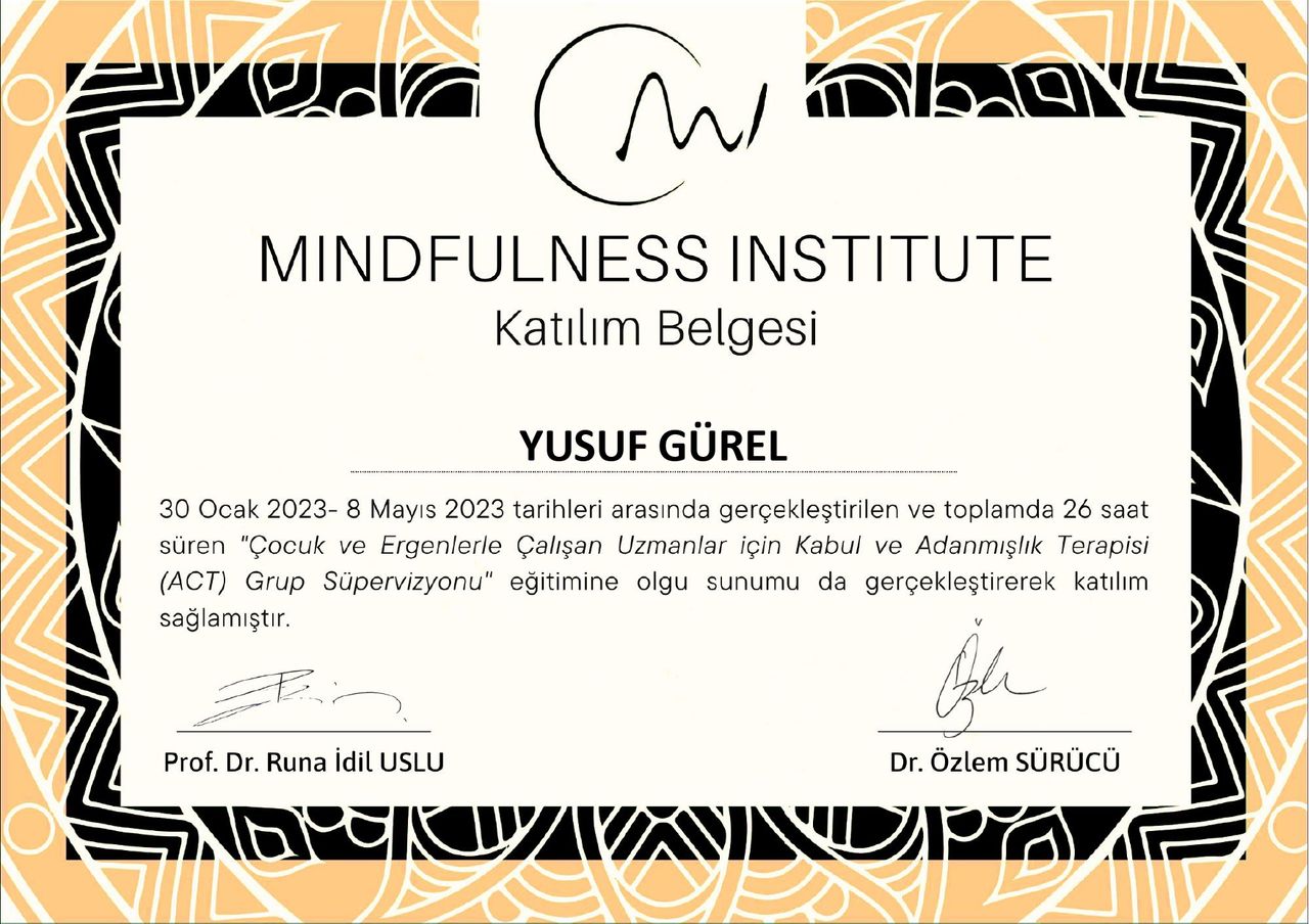 Sayın hocamla çocuğum çok zor bir süreç yaşarken tavsiye üzerine görüştük. Daha sonrasında çocuğum tedavi sürecini kabul eti burada Yusuf Hocamın gösterdiği çaba, sabrı, özverisi ,yaklaşımı çok değerli. İletişimi çok çok iyi.Aşamayacagımızı düşündüğümüz problemleri onun rehberliğinde çözdük.Kendisine çok. İyi ki varsınız Yusuf hocam.Herkese tavsiye ediyorum.