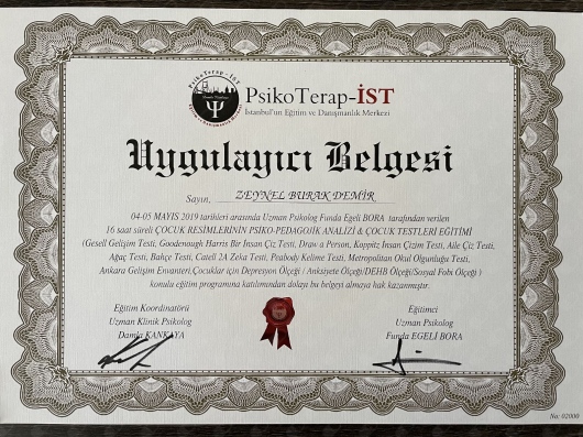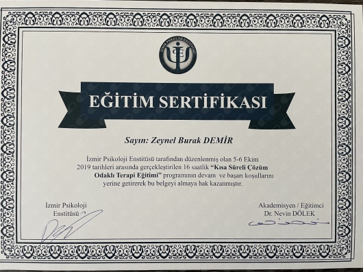 Lisans eğitimi ve Yüksek Lisans eğitimi süreçlerinde Manisa Ruh ve Sinir Hastalıkları hastanesinde staj programlarını başarı belgesi ile tamamlayan Z. Burak DEMİR, Lisans ve Yüksek Lisans eğitimleri dışında Bilişsel Davranışçı Terapi Derneği Temel Eğitim, Davranış Bilimleri Enstitüsü 1. Düzey EMDR eğitimi ve Çözüm Odaklı terapi eğitimleri almıştır. Göz Hareketleri ile Duyarsızlaştırma ve Yeniden İşleme(EMDR) Araştırma Geliştirme ve Uygulama Derneği üyesidir.