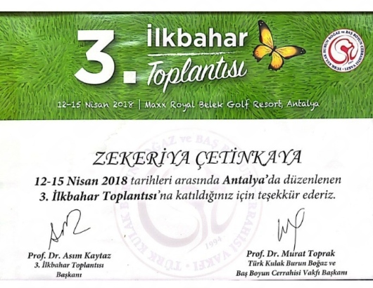 2- Karatas, E., Z. Çetinkaya, “Atipik Meniere Hastalığı: Tekrarlayan Ani işitme Kaybı olarak takip edilen olgu sunumu” 33. Türk Ulusal Kulak Burun Boğaz ve Baş-Boyun Cerrahisi Kongresi, P74, Antalya, 2011. (POSTER)