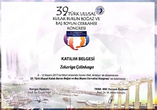 -39. Türk Ulusal Kulak Burun Boğaz ve Baş Boyun Cerrahisi Kongresi Antalya 8-12 Kasım 2017