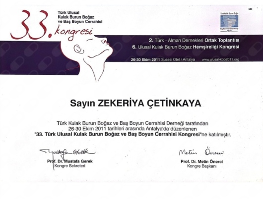 - 33. Türk Ulusal Kulak Burun Boğaz ve Baş Boyun Cerrahisi Kongresi Antalya 26-30 Ekim 2011