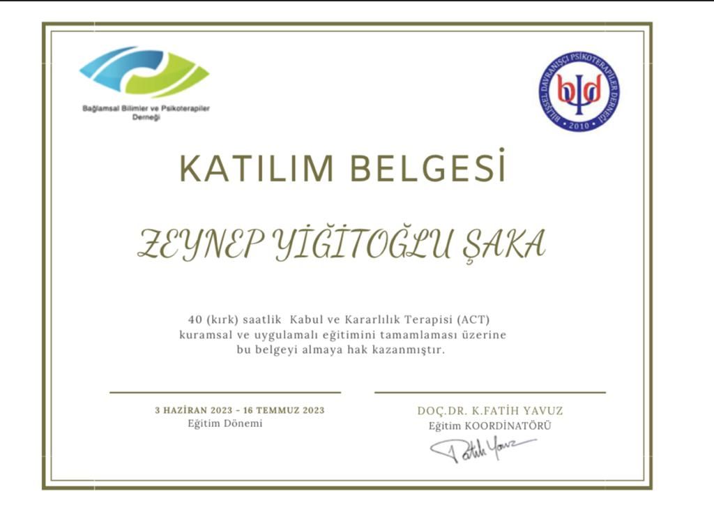 Merhaba, ben Klinik Psikolog Zeynep Yiğitoğlu. İlkokul, ortaokul ve liseyi Ankara'da okudum. Ankara Yıldırım Beyazıt Üniversitesi Psikoloji Bölümünden "Yüksek Onur" derecesi ile fakülte ikincisi olarak mezun oldum. Ardından Ankara Yıldırım Beyazıt Üniversitesi Klinik Psikoloji Tezli Yüksek Lisans programından yüksek onur öğrencisi olarak mezun oldum. Üniversite yıllarımdan itibaren pek çok farklı alanda staj eğitimimi tamamladım ve şu anda çeşitli kurumlarda danışmanlık hizmeti vermekteyim. Üniversite yıllarımda nicel ve nitel olmak üzere çeşitli araştırmalar yaptım ve bu araştırmaların sonucunda TÜBİTAK Bursiyeri olmaya hak kazandım. Bu kapsamda Covid Salgınında en ön sırada yer alan sağlık çalışanları ile çalışmalar yürüttüm. Araştırmamın sonuçlarını kongrede sunarak bu çalışmayı tamamladım. Aynı zamanda Bekar Kadınların Algıladığı Ayrımcılığı Türkiye örnekleminde çalışarak bu alandaki sonuçları da kongrede sunma fırsatı buldum. Psikoloji alanında akademik çalışmalarımı sürdürmekle beraber sahada da aktif rol almaktayım. Ergen ve yetişkinlere online ve yüz yüze terapi hizmeti vermekteyim. Aynı zamanda travma ve yas danışmanlığı alanında kurumlara danışmanlık hizmeti sağlamaktayım. Bu noktada yakın zamanda yaşadığımız asrın felaketi olan depremde de psikososyal alanında aktif rol almış bulunmaktayım. Terapi Eğitimleri ve Süpervizyonlar -Çocuk Merkezli Oyun Terapisi – Mehmet TEBER / 28 Saat -Kabul ve Kararlılık Terapisi Eğitimi- Dr. Fatih Yavuz / 40 Saat -Dr. Öğr. Üyesi Emine İNAN- Bilişsel Davranışçı Terapi Süpervizyonu -Dr. Öğr. Üyesi Yankı SÜSEN- Dinamik Yönelimli Kısa Süreli Terapi Süpervizyonu